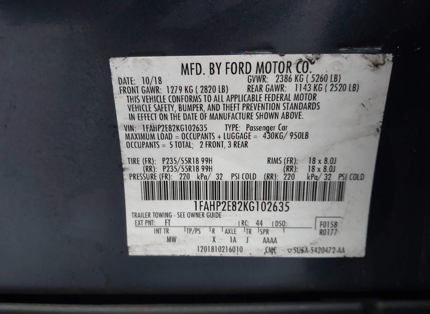 VIN: 1FAHP2E82KG102635 · Conshohocken, PA, 19428 · PA Salvage