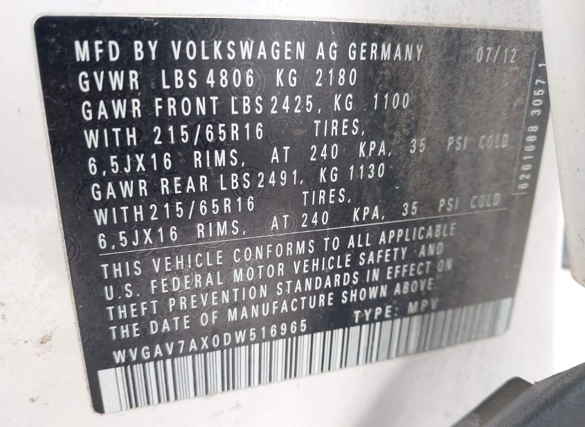VIN: WVGAV7AX0DW516965 · EMINENCE, KY, 40019 · TX SALVAGE