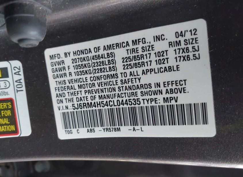 VIN: 5J6RM4H54CL044535 · Gibsonia, PA, 15044 · PA Salvage