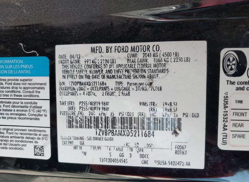 VIN: 1ZVBP8AMXD5211684 · BELL COUNTY, TX, 76527 · TX SALVAGE