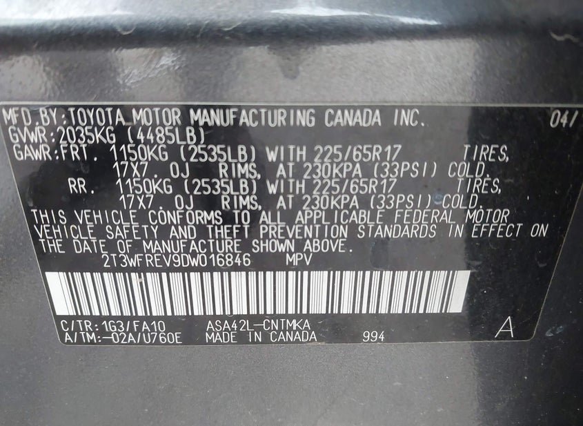VIN: 2T3WFREV9DW016846 · Justin, TX, 76247 · TX Salvage