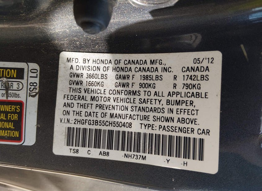 VIN: 2HGFG3B55CH550408 · Simpsonville, SC, 29681 · SC Salvage