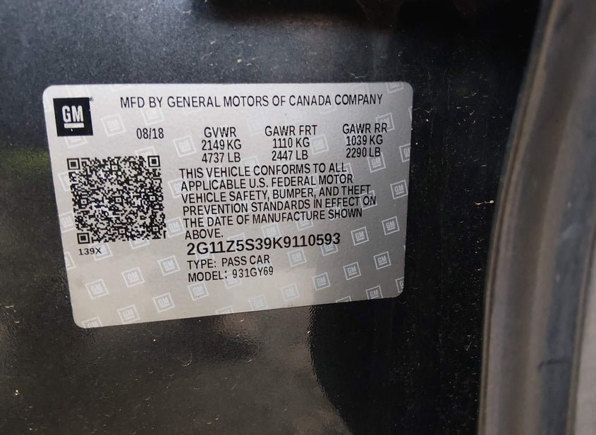 VIN: 2G11Z5S39K9110593 · Simpsonville, SC, 29681 · SC Salvage