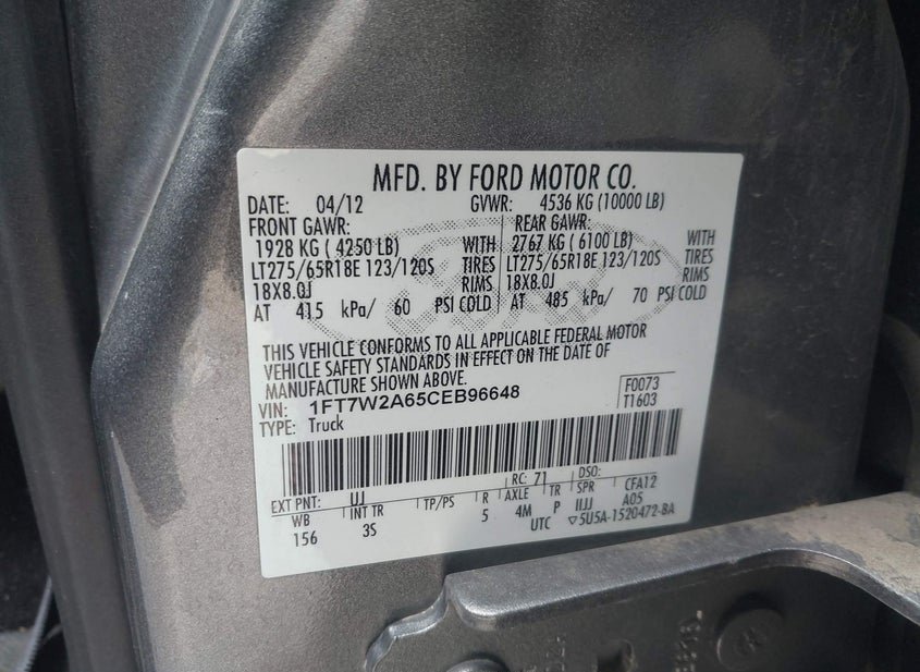 VIN: 1FT7W2A65CEB96648 · JURUPA VALLEY, CA, 92509 · CA SALVAGE
