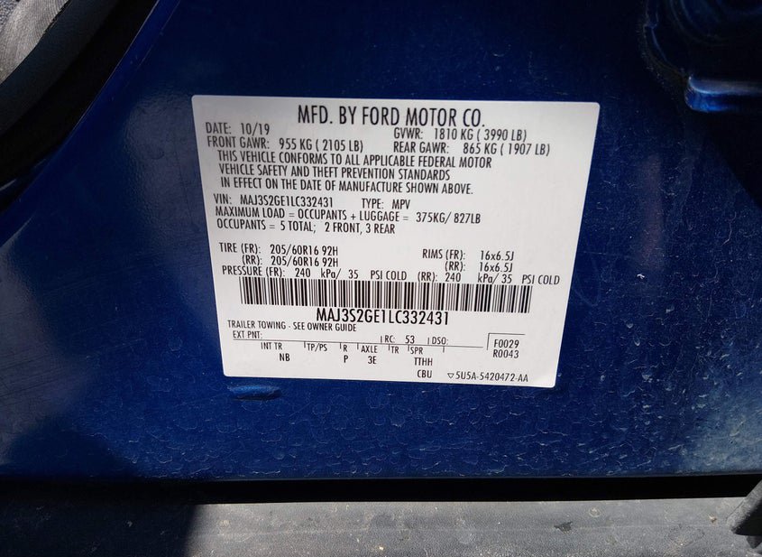 VIN: MAJ3S2GE1LC332431 · ODESSA, MO, 64076 · MO SALVAGE