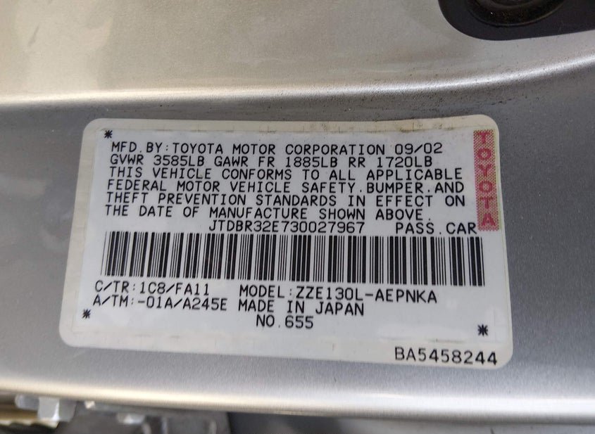 VIN: JTDBR32E730027967 · GARDENA, CA, 90248 · CA SALVAGE