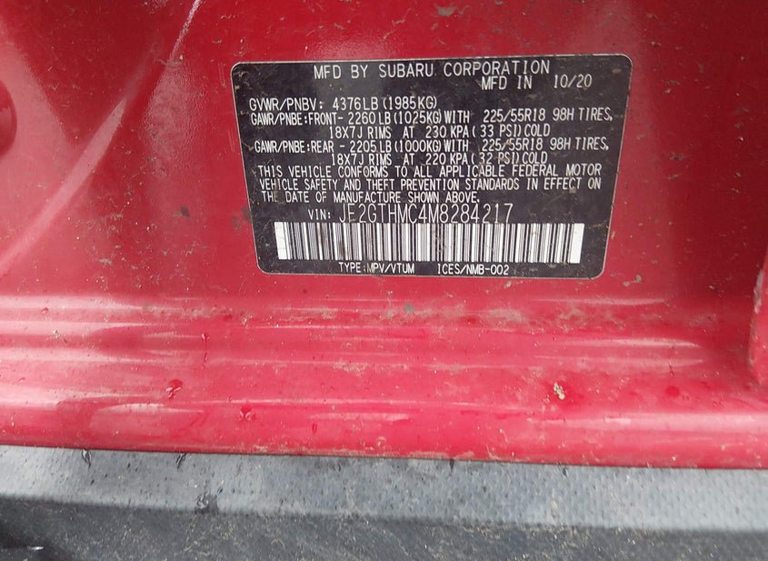 VIN: JF2GTHMC4M8284217 · ENGLISHTOWN, NJ, 07726 · NJ SALVAGE TITLE MILEAGE 60480