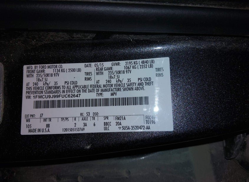 VIN: 1FMCU9J99FUC62647 · ODESSA, MO, 64076 · MO CLEAR