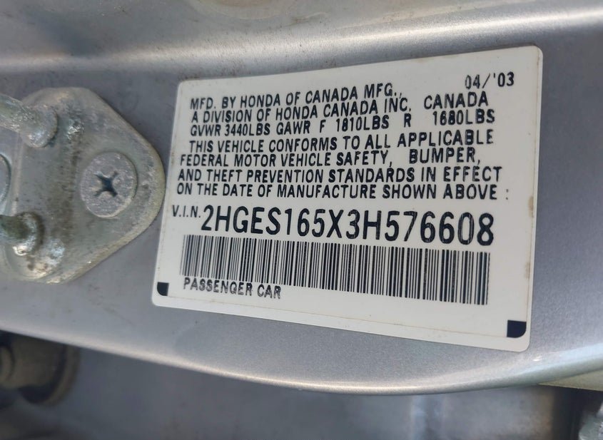 VIN: 2HGES165X3H576608 · Castle Hayne, NC, 28429 · NC Clear-Dealer Only PER AUTOCHECK AIRBAG DEPLOYED