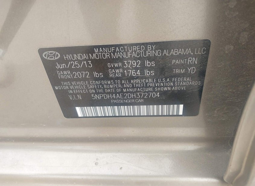 VIN: 5NPDH4AE2DH372704 · HAWLEY, TX, 79601 · TX ORIGINAL OWNER ATTESTS TO 105000
