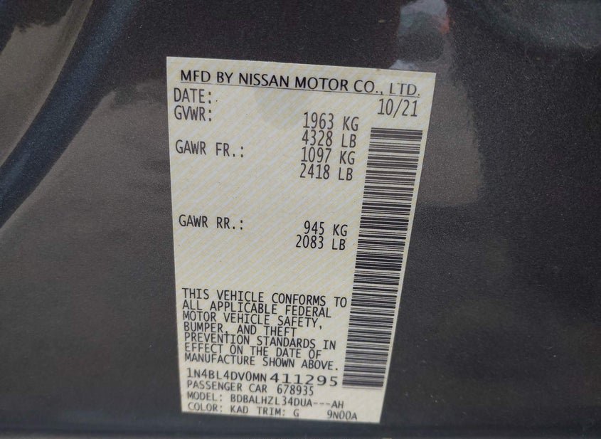 VIN: 1N4BL4DV0MN411295 · NASHVILLE, TN, 37218 · TN SALVAGE