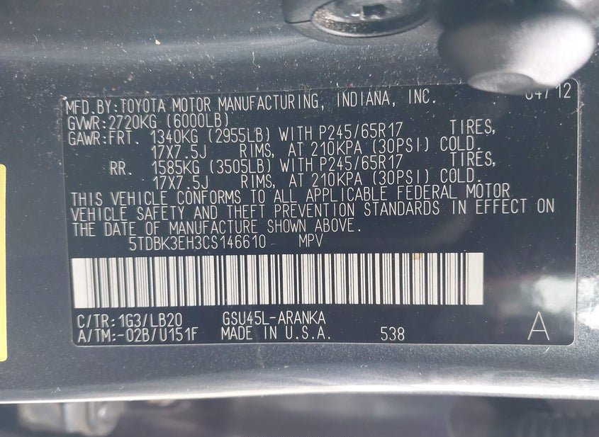 VIN: 5TDBK3EH3CS146610 · Grove City, OH, 43123 · OH Salvage