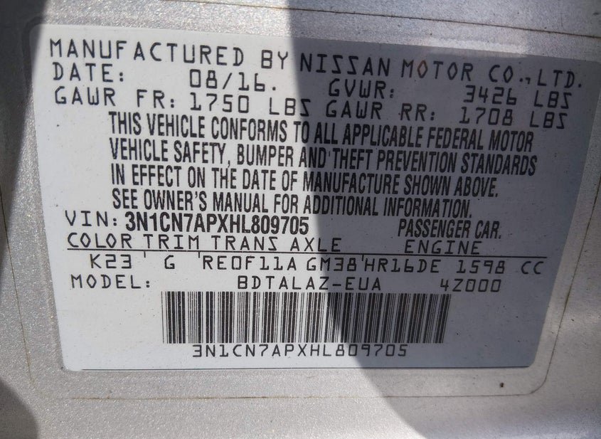 VIN: 3N1CN7APXHL809705 · Headland, AL, 36345 · AL Nrc Lienholder Repossession Paperwork