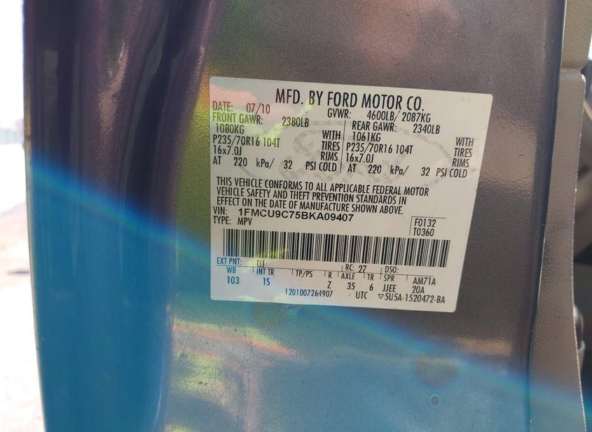 VIN: 1FMCU9C75BKA09407 · BALTIMORE, MD, 21226 · MD CLEAR