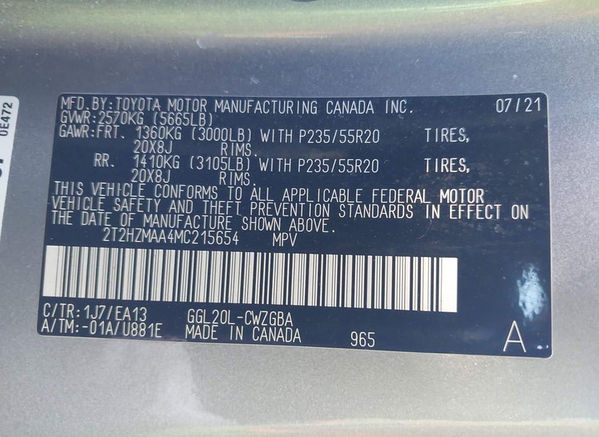 VIN: 2T2HZMAA4MC215654 · Phoenix, AZ, 85041 · AZ Salvage