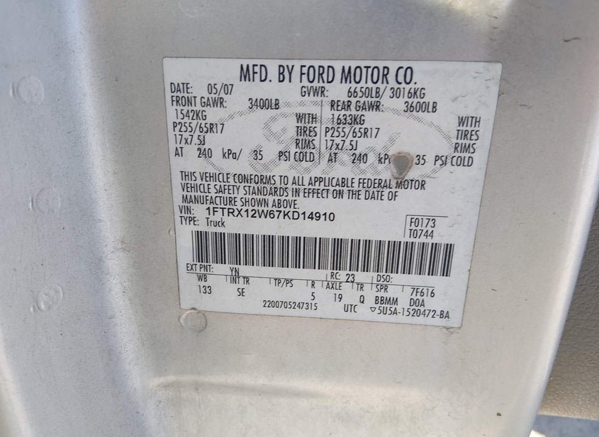VIN: 1FTRX12W67KD14910 · Carville, LA, 70721 · LA Salvage