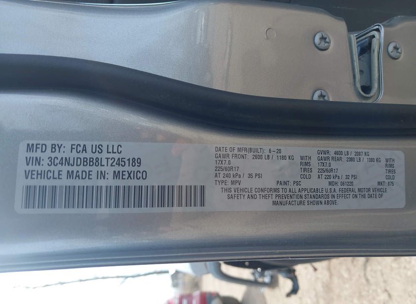 {"StockHash":"44692745","SellingBranch":"CLEVELAND (OH)","VINStatus":"3C4NJDBB8LT245189 (OK)","VehicleScore":"12","Vehicle":"AUTOMOBILE","VehiclesVehicleLocation":"TERMINAL DRIVE\n7451 TERMNAL DR.\nLORAIN, OH, 44053\n440-960-1050","More":"<H6 CLASS='SUBHEAD'>OFFSITE ANNOUNCEMENTS</H6><P CLASS='TEXT-SM MB-0'><STRONG>HOURS OF OPERATION</STRONG></P><P CLASS='TEXT-SM'><STRONG>HOURS OF OPERATION HAVE NOT BEEN VERIFIED</STRONG></P><P CLASS='TEXT-SM'><STRONG>VEHICLES MUST BE PAID THROUGH IAA</P></STRONG><P CLASS='TEXT-SM'><STRONG>AUTHORIZATION FOR OFF-SITE SALE RELEASE FORM IS RECOMMENDED FOR PICKUP. THIS FORM WILL BE EMAILED UPON PAYMENT POSTING TO YOUR ACCOUNT OR IT CAN BE OBTAINED THROUGH THE SELLING BRANCH</STRONG></P><P CLASS='TEXT-SM'>IS PRE-SALE OFF-SITE INSPECTION AVAILABLE?<STRONG> YES</STRONG></P><P CLASS='TEXT-SM'>NOTE: CONTACT CLEVELAND BRANCH 440-960-1050 FOR ACCESS.</P><P CLASS='TEXT-SM'>PICK UP INSTRUCTIONS: CONTACT CLEVELAND BRANCH 440-960-1050 FOR ACCESS.</P><P CLASS='TEXT-SM'>ARE LOADING SERVICES AVAILABLE?<STRONG> YES</STRONG></P><P CLASS='TEXT-SM'>ARE TOWING SERVICES AVAILABLE?<STRONG> NO<STRONG></P>OTHER INFORMATION: CONTACT CLEVELAND BRANCH 440-960-1050 FOR ACCESS.","AuctionDateTime":"4/21/2026 1:30:00 PM +00:00","Lane":"AVAILABLE TWO DAYS BEFORE SALE","Aisle":"AVAILABLE TWO DAYS BEFORE SALE"}