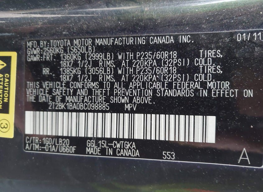 VIN: 2T2BK1BA0BC098885 · Portage, WI, 53901 · WI Junk Bill Of Sale Mv2459