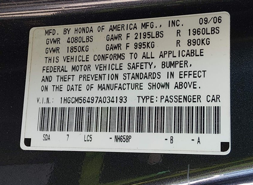VIN: 1HGCM56497A034193 · Salem, NH, 03079 · MA Clear