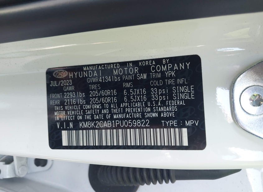 VIN: KM8K2CAB1PU059822 · North Hollywood, CA, 91605 · CA Salvage