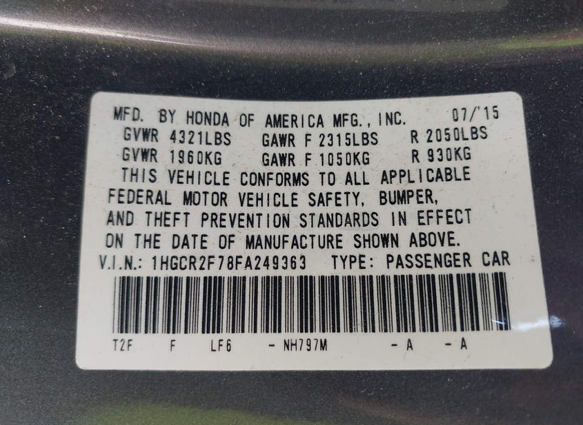 VIN: 1HGCR2F78FA249363 · WILMINGTON, CA, 90744 · CA SALVAGE