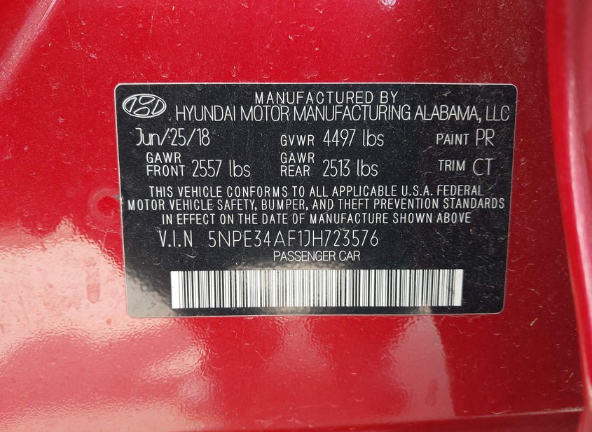 VIN: 5NPE34AF1JH723576 · BELL COUNTY, TX, 76527 · TX CLEAR POSSIBLE ROLLBACK HISTORY