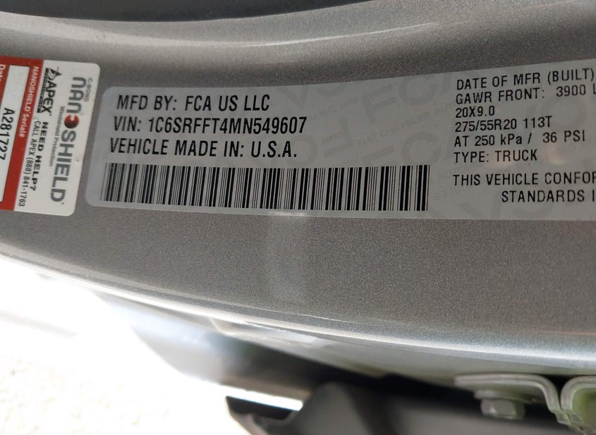 VIN: 1C6SRFFT4MN549607 · BELL COUNTY, TX, 76527 · TX CLEAR POSSILE ROLLBACK HISTORY