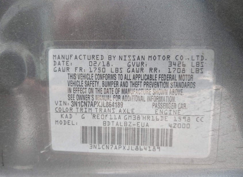 VIN: 3N1CN7APXJL864189 · BELL COUNTY, TX, 76527 · CA SALVAGE