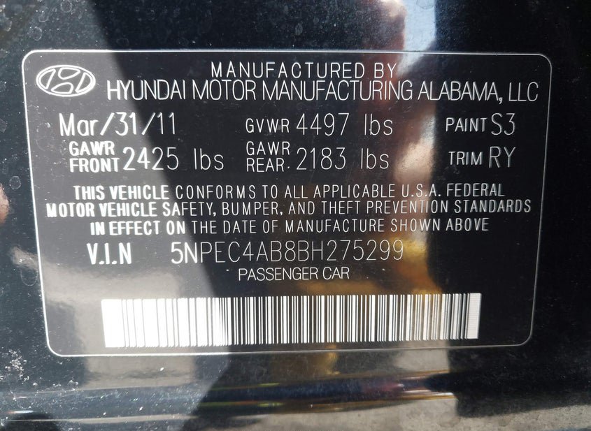VIN: 5NPEC4AB8BH275299 · DIXON, CA, 95620 · CA SALVAGE