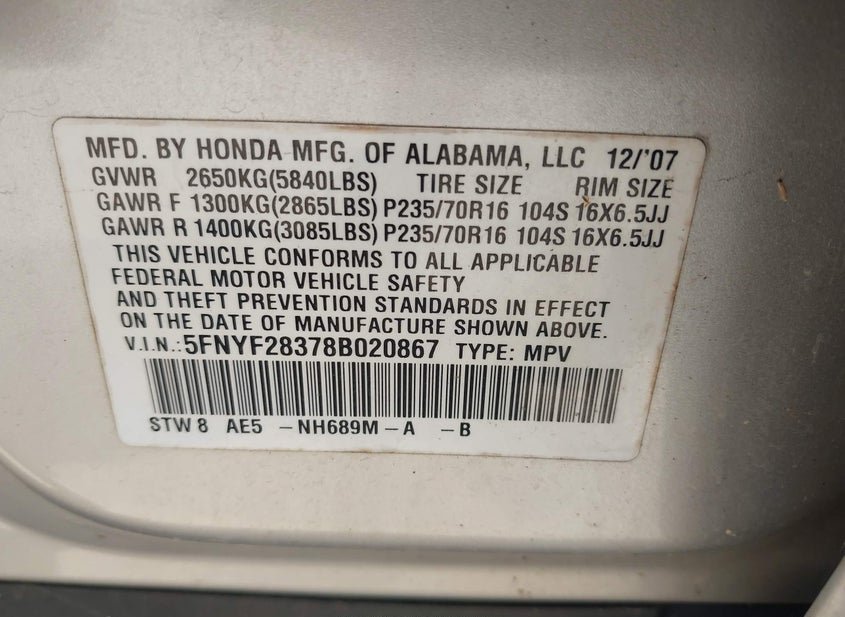 5FNYF28378B020867