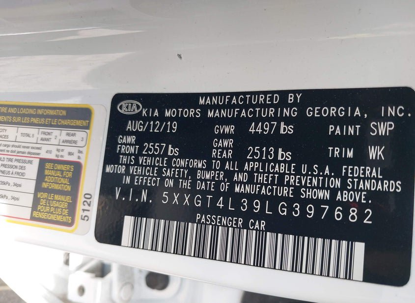 VIN: 5XXGT4L39LG397682 · Brandywine, MD, 20613 · MD Salvage - 75% Or Less