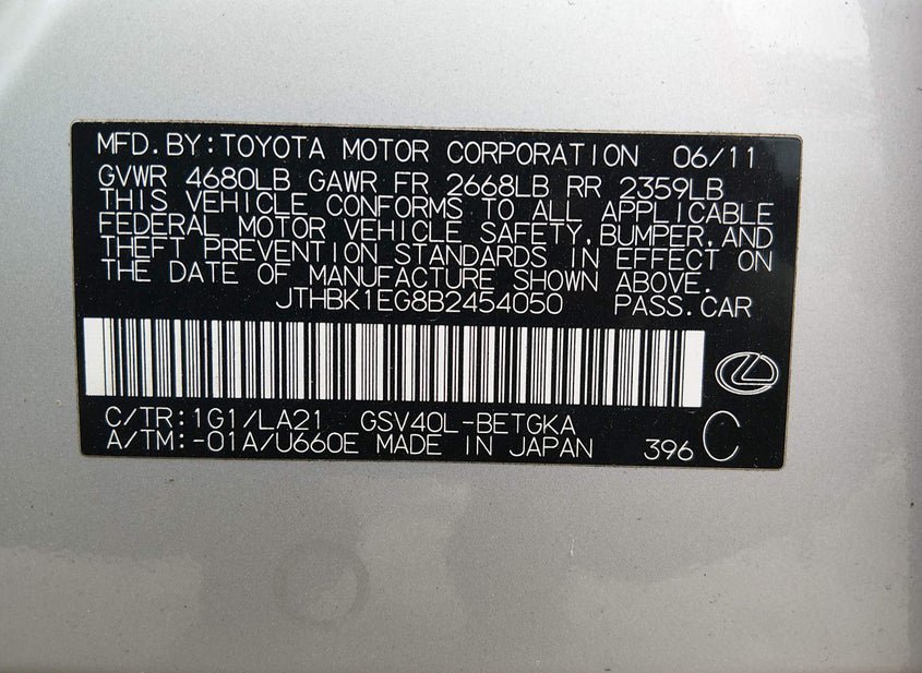 VIN: JTHBK1EG8B2454050 · BRANDYWINE, MD, 20613 · MD SALVAGE - GREATER THAN 75%