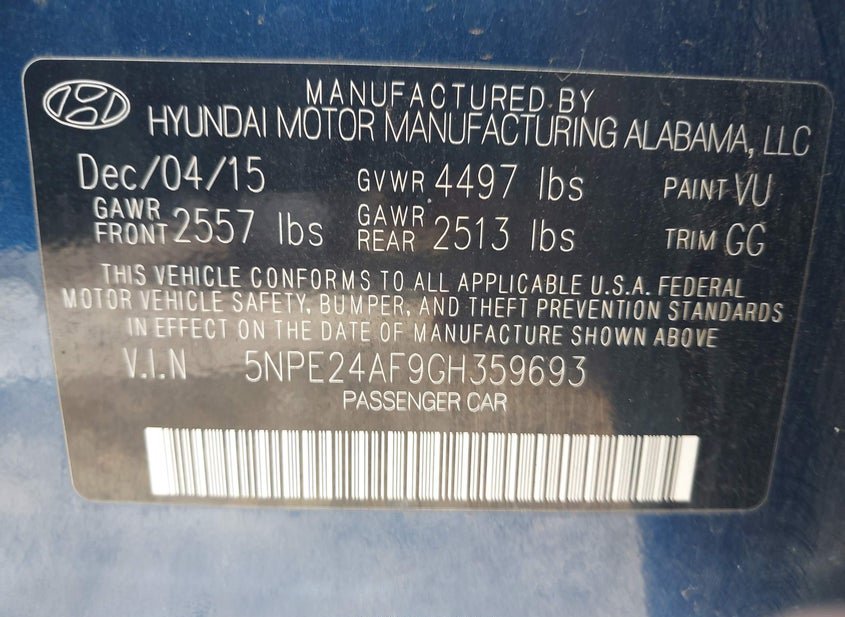 VIN: 5NPE24AF9GH359693 · North Hollywood, CA, 91605 · CA Clear - Dealer Only DMV FEE $ 183.00
