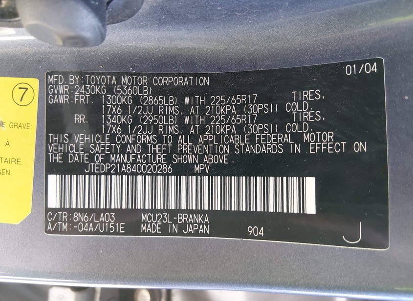 VIN: JTEDP21A840020286 · Las Vegas, NV, 89122 · NV Clear