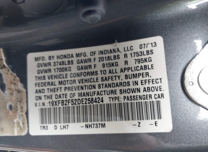 VIN: 19XFB2F52DE258424 · Charlotte, NC, 28206 · SC Repossession Paperwork