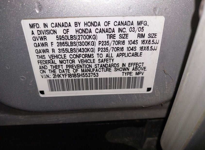 VIN: 2HKYF18185H553753 · Meridian, ID, 83642 · ID Salvage