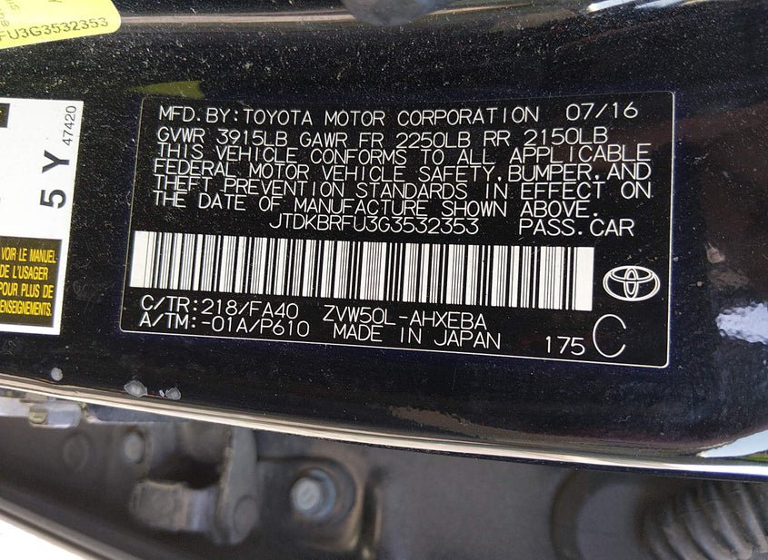 VIN: JTDKBRFU3G3532353 · Simpsonville, SC, 29681 · SC Clear SC CLEAR NO DUP IF LOST
