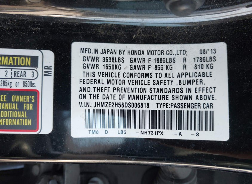 VIN: JHMZE2H56DS006818 · North Hollywood, CA, 91605 · CA Salvage