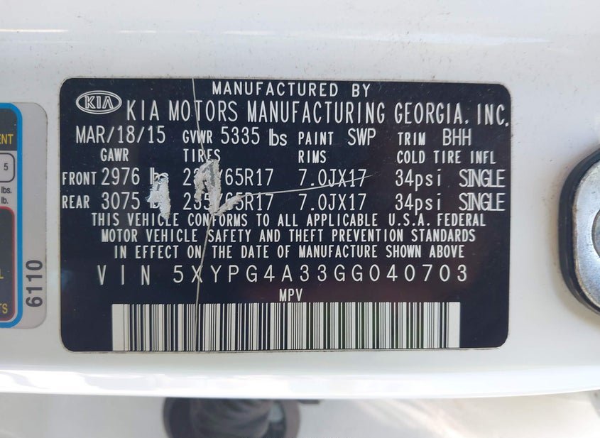 VIN: 5XYPG4A33GG040703 · BALTIMORE, MD, 21226 · MD CLEAR