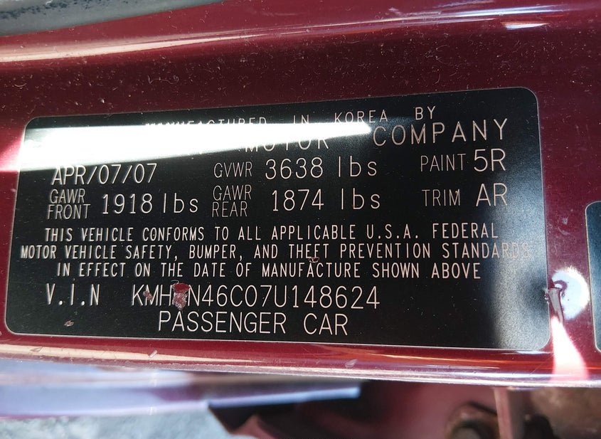VIN: KMHCN46C07U148624 · PORT MURRAY, NJ, 07865 · NJ CLEAR