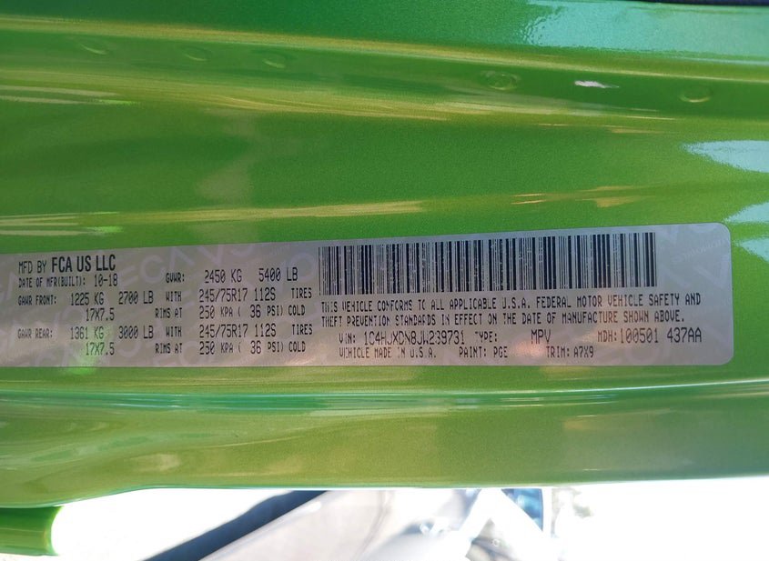 VIN: 1C4HJXDN8JW239731 · DEER PARK, NY, 11729 · WV ORIGINAL NY REASSIGNMENT