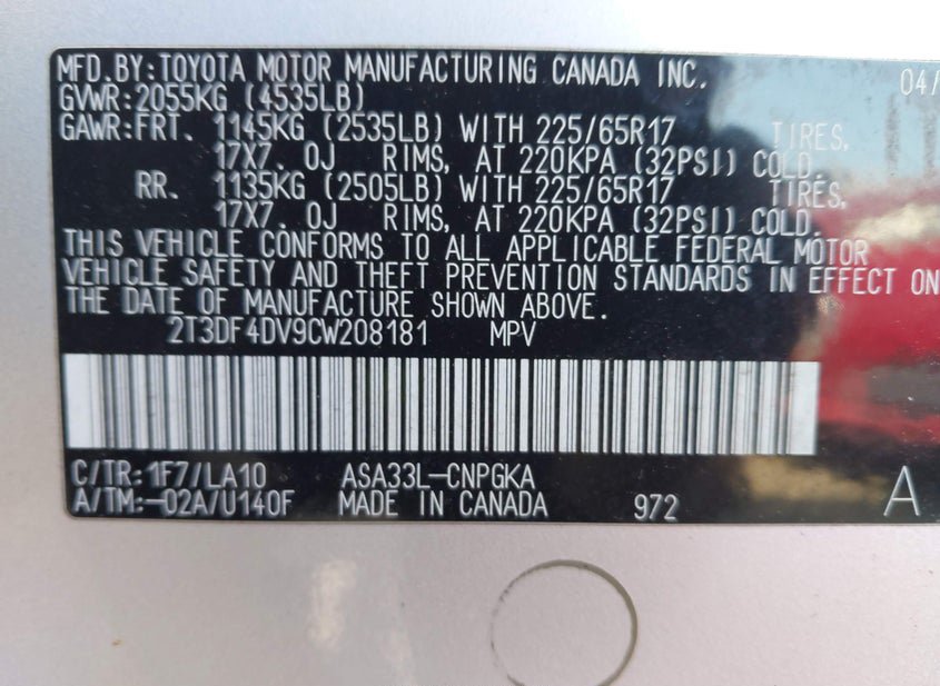 VIN: 2T3DF4DV9CW208181 · BELLEVILLE, MI, 48111 · MI CLEAR