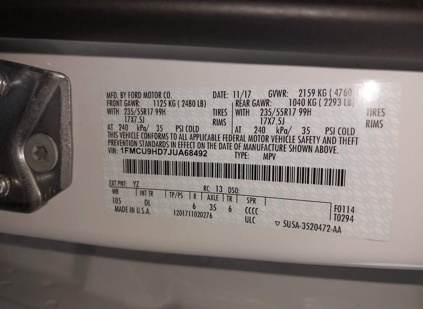 VIN: 1FMCU9HD7JUA68492 · Sayreville, NJ, 08872 · NJ Clear