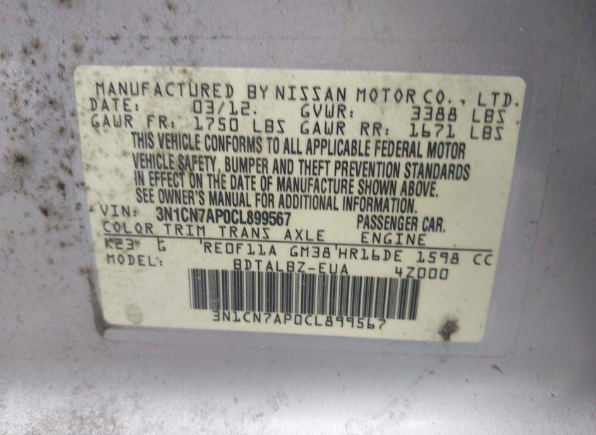 VIN: 3N1CN7AP0CL899567 · Kansas City, KS, 66111 · KS Clear
