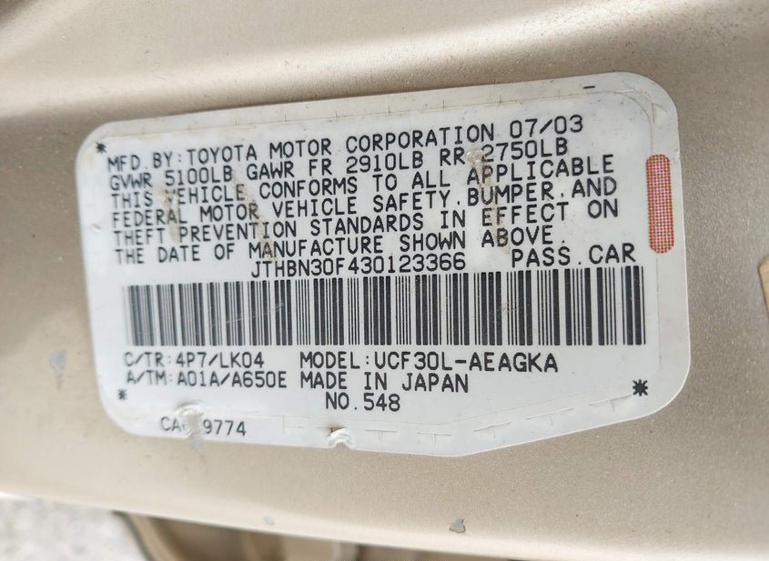VIN: JTHBN30F430123366 · JURUPA VALLEY, CA, 92509 · CA CLEAR - DEALER ONLY DMV FEES $185.00
