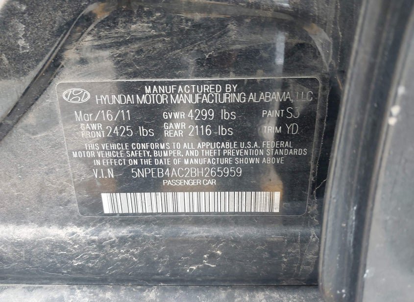 VIN: 5NPEB4AC2BH265959 · Fontana, CA, 92335 · CA Clear - Dealer Only CA DMV FEES $626