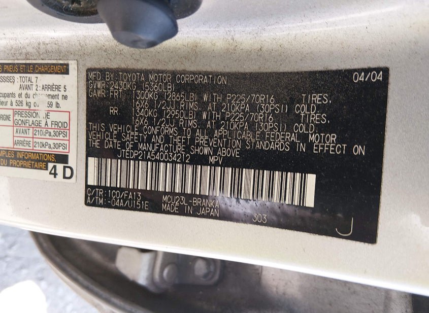 VIN: JTEDP21A540034212 · ASHLAND, VA, 23005 · VA CLEAR