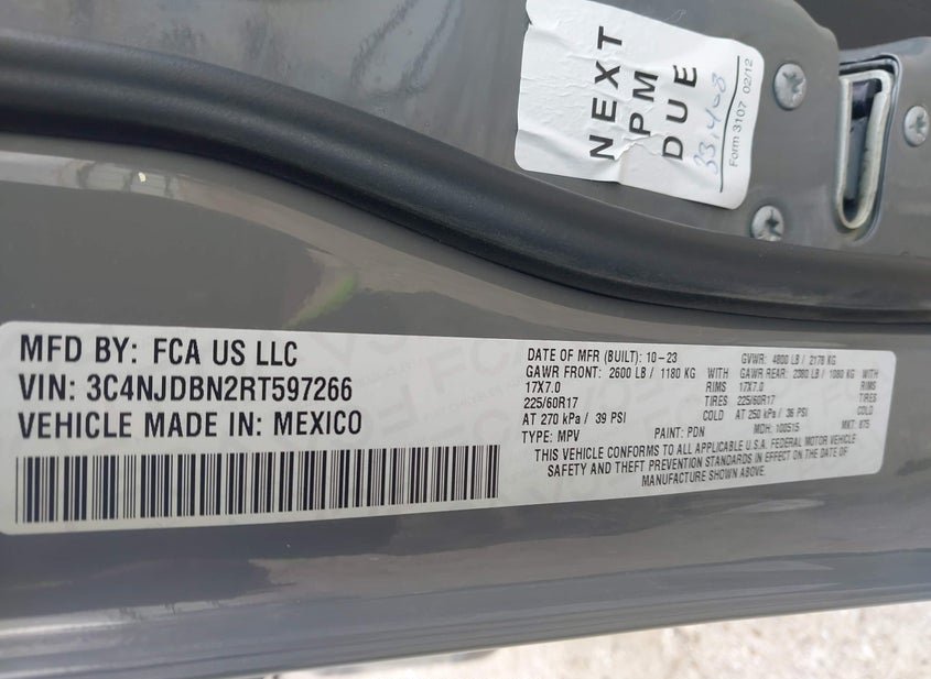 {"StockHash":"44861006","SellingBranch":"HOUSTON-NORTH (TX)","VINStatus":"3C4NJDBN2RT597266 (OK)","VehicleScore":"38","Vehicle":"AUTOMOBILE","VehiclesVehicleLocation":"AT THE BRANCH","AuctionDateTime":"4/16/2026 2:30:00 PM +00:00","Lane":"C - #63","Aisle":"MM - 29","Brand":"CLEAR","Notes":"VEHICLE BEING SOLD WITH TITLE PENDING - TBO"}