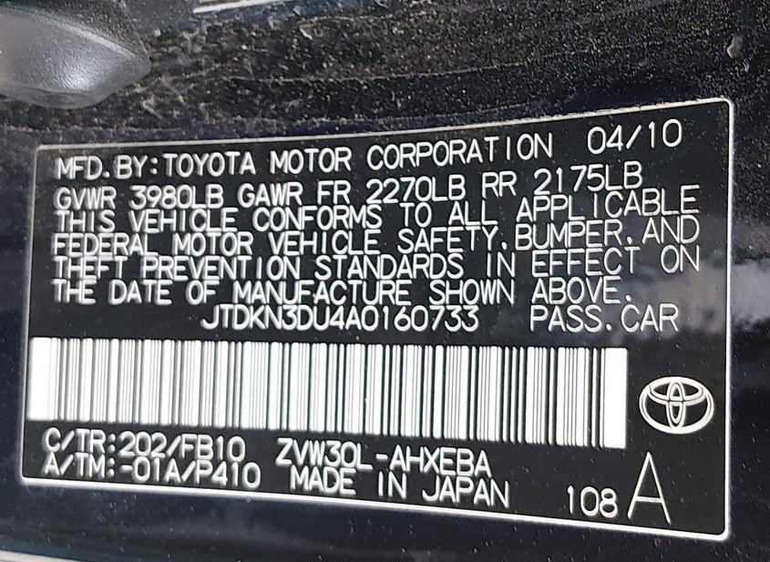 VIN: JTDKN3DU4A0160733 · Grand Prairie, TX, 75050 · TX Original