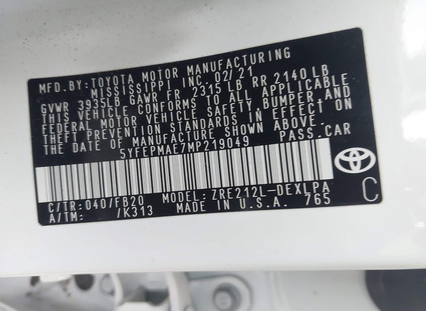 VIN: 5YFEPMAE7MP219049 · Charlotte, NC, 28206 · FL Certificate Of Destruction